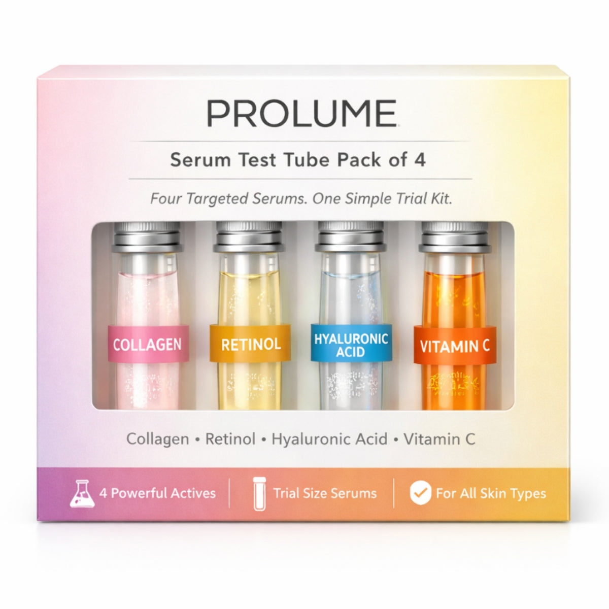 The Prolume Serum Test Tube Pack of 4 is designed to help you experience targeted skincare before committing to a full-size product. Each test tube contains a different active serum to address specific skin concerns—hydration, glow, repair, and skin renewal.
